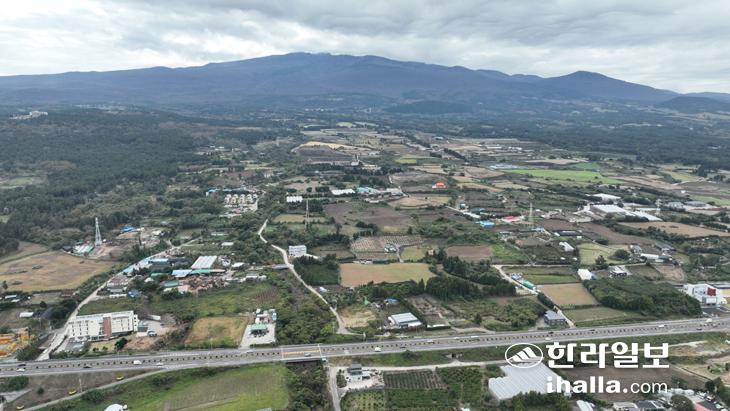 과거 화전 농사가 이뤄졌던 제주시 영평동 일대와 한라산을 드론으로 촬영했다. 화전, 화전 마을은 중산간 일대는 물론 한라산 고지대까지 존재했다. 사진 아래는 제주시 애월읍과 조천읍을 연결하는 애조로. 특별취재팀