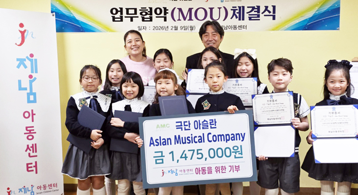 제남아동센터(원장 원부규)는 지난 9일 센터 내에서 극단 아슬란(Aslan Musical Company·단장 지은혜)과 아동 문화예술 지원을 위한 업무협약을 체결하고 공연 수익금 147만5000원을 후원했다.