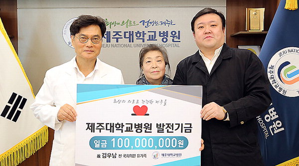 [한라일보] 김우남 의원 유가족이 12일 제주대학교병원(병원장 최국명)을 방문, 병원 발전기금 1억원을 기부했다.