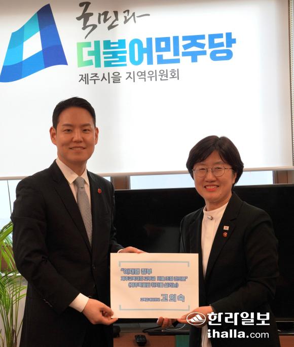 고의숙 제주도교육감 예비후보가 지난 28일 김한규 국회의원에게 '제주교육재정 교부금 비율 조정 건의문'을 전달하고 있다. 고의숙 예비후보 선거사무소 제공