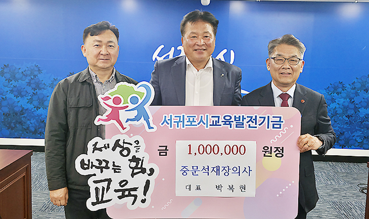 중문석재장의사(대표 박복현)는 지난 26일 서귀포시청 중회의실에서 열린 (재)서귀포시교육발전기금 제1회 이사회에서 이사장 김문수에 교육발전기금 100만원을 전달했다.