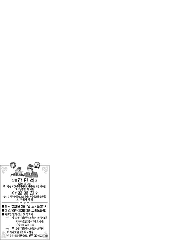 ▶강신철군(일광교통관광(주) 근무, 4·3유족중문지회장 강완준·임옥선씨 삼남) 고안성양(예래 논짓물놀이방 근무, 고응삼·이정열씨 장녀) 낮 12시 88올림픽 생활체육관 ☎신랑 7일 색달동 신랑자택 011-9727-0616(신랑)·017-693-0616(신랑부친), 신부 당일 서귀포 잔치타운 010-6602-1215(신부)·011-693-1079(신부부친)