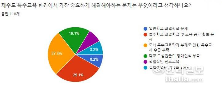 이번 정책 제안은 도내 장애학생 학부모 112명을 대상으로 실시한 설문조사를 바탕으로 이뤄졌다. 해당 설문은 제주도 특수교육 환경에서 우선적으로 해결해야 하는 과제, 특수학교·특수학급 과밀 현상 해소 방안 등을 내용으로 진행됐다.