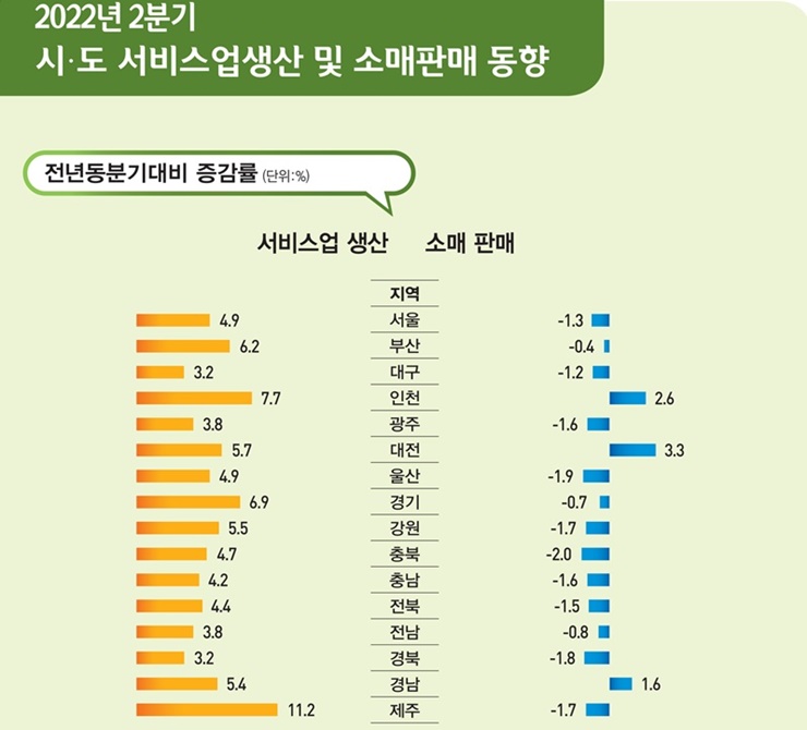 [한라일보] 올해 2분기 제주지역 서비스업생산이 코로나19 일상회복에 따른 관광시장 회복으로 전국에서 최고 상승률을 기록했다. 하지만 소매판매는 4분기만에 감소세로 돌아섰는데, 승용차 판매 부진과 물가 상승에 따른 소비심리 위축이 영향을 미친 것으로 풀이된다.