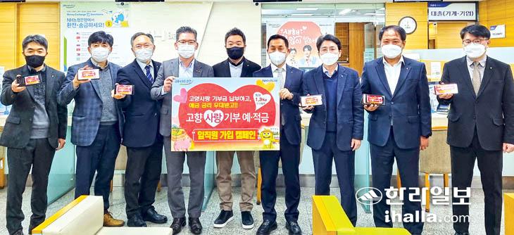 NH농협은행 제주본부는 25일 농협은행 제주영업부 객장에서 윤재춘 농협중앙회 제주본부장, 고우일 NH농협은행 제주본부장, 고창균 NH농협지부 제주지역위원장 등이 참석한 가운데 'NH고향사랑기부 예·적금' 임직원 가입 캠페인을 진행했다. NH고향사랑기부 예·적금은 전국 영업점과 농협 인터넷·스마트 뱅킹을 통해 100만원 이상 예금과 월 1만원 이상 50만원 이내의 적금에 가입할 수 있다. 고향을 사랑한다는 의미를 담아 가입고객 모두에게 특별 우대금리 0.40%포인트(p)를 제공하며 고향사랑 기부금납부 0.5%p, 만65세 이상을 대상으로 0.1%p 우대금리를 제공한다.