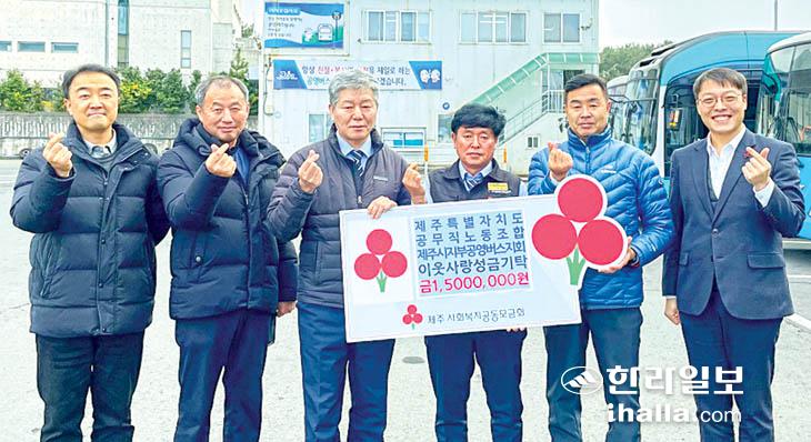 제주특별자치도공무직노동조합 제주시지부 공영버스지회(회장 정형수)는 지난 20일 제주시 공영버스 차고지에서 설맞이 이웃사랑 성금 150만원을 제주사회복지공동모금회(회장 강지언)에 기탁했다.