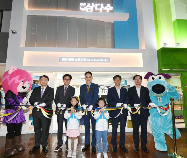 제주삼다수 키자니아 신규 체험관 오픈식 행사. 뒷줄 좌측부터 이호윤 키자니아 이사, 강재형 키자니아 대표이사, 백경훈 제주개발공사 사장, 이경호 제주개발공사 기획이사, 김용덕 제주개발공사 영업본부장.