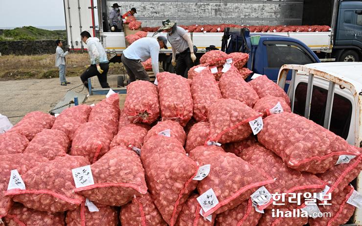 농협제주본부가 소비 감소로 수급이 불안한 제주산 햇마늘 소비촉진 행사를 오는 10일 본부 주차장과 12일 도내 13개 하나로마트에서 진행한다. 사진은 지난달 22일 올해 첫 마늘 수매가 진행된 대정농협 유통센터. 한라일보DB