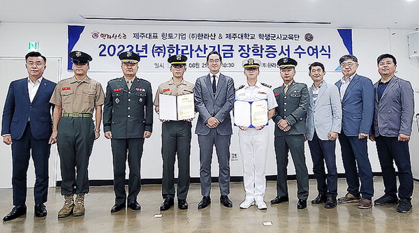 제주 향토기업 (주)한라산(대표이사 현재웅)은 21일 (주)한라산 본사에서 제주대학교 학생군사교육단(ROTC) 장학증서 수여식을 갖고, 해병·해군 학군사관 후보생 2명에게 총 200만원의 장학금을 전달했다.