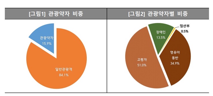 분석 결과 연간(2021년 8월~2022년 7월) 제주를 찾는 관광약자는 약 148만명으로, 전체 내국인 방문자 933만명(도민과 180일 초과 체류자 제외)의 15.9%를 차지했다. 유형별로는 장애인을 제외한 65세 이상 고령자가 76만명으로 51.0%를 차지했고 다음으로 만 4세 이하 자녀 동반가족 52만명(34.9%), 장애인 20만명(13.5%), 임산부 8000명(0.5%) 등의 순이었다.