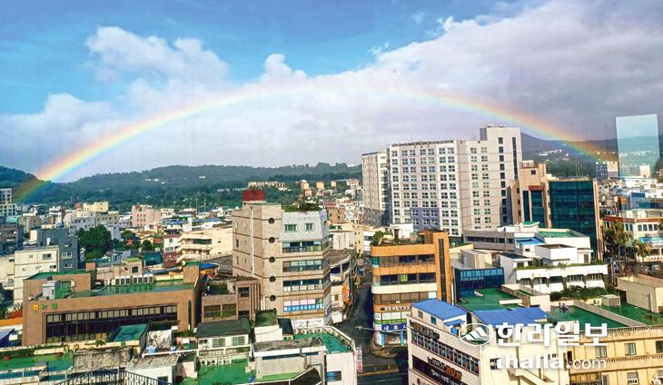제6호 태풍 '카눈'이 지나간 10일 오전, 서귀포시 도심 위로 일곱빛깔 무지개가 맑은 하늘을 배경으로 곱게 드리웠다. 사진=서귀포시 일호광장 소재 오피스텔에서 독자 구자분