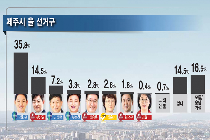 지역별로도 김한규 의원이 1권역(봉개·삼양·아라·화북동), 2권역(건입·이도1·이도2·일도1·일도2동), 3권역(구좌읍·우도면·조천읍) 등 모든 권역에서 타 후보를 앞질렀다.