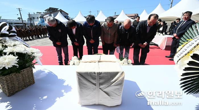 5일 오후 제주시 조천읍 북촌포구에서 대전 골령골 유해발굴을 통해 신원이 확인된 행방불면 43희생자 김한홍씨의 유해 봉환식이 열리고 있다. 이상국 기자