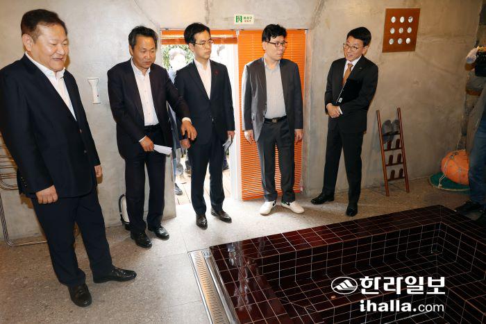 제10회 중앙지방정책협의회 참석차 제주를 방문한 이상민 행정안전부 장관이 9일 빈집 재생 스타트업 '다자요'가 리모델링해 운영하는 제주시 조천읍 북촌포구집을 둘러보고 있다. 연합뉴스