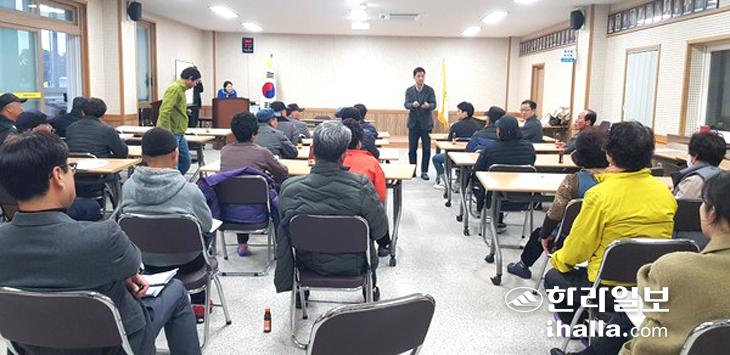 지난달 서귀포시 성산읍 오조리 마을회관에서 열린 습지보호지역 지정 주민공청회 모습.