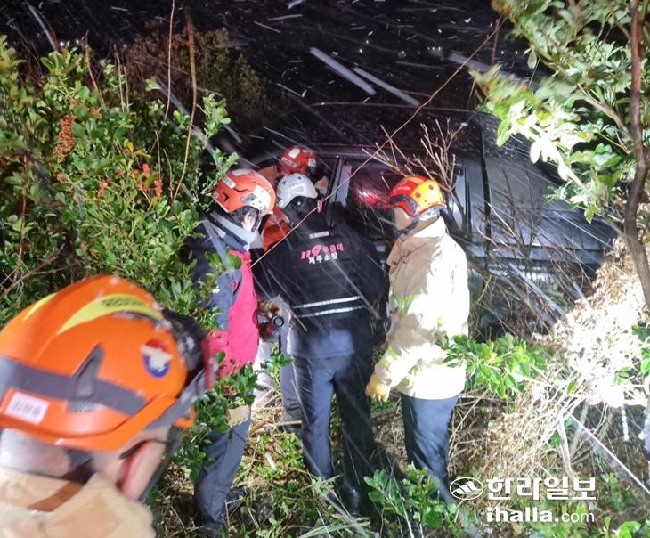 제주시 한림읍 귀덕리에서 눈길에 미끄러져 도로 옆 고랑에 빠진 차량의 운전자를 소방대원이 구조하고 있다. 제주도소방안전본부 제공