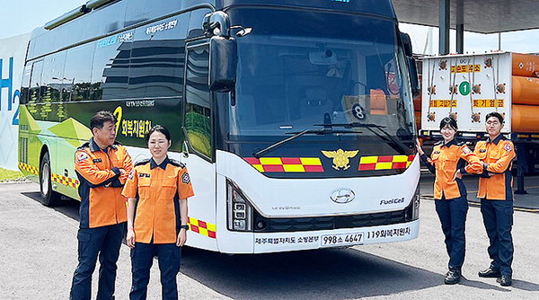 수소연료 기반의 무공해 친환경 119회복지원차량이 전국서 제주에 최초로 도입된다. 제주도 소방안전본부는 27일 제주 CFI 에너지미래관에서 수소연료 119회복지원차량 무상기부 전달식을 진행했다.
