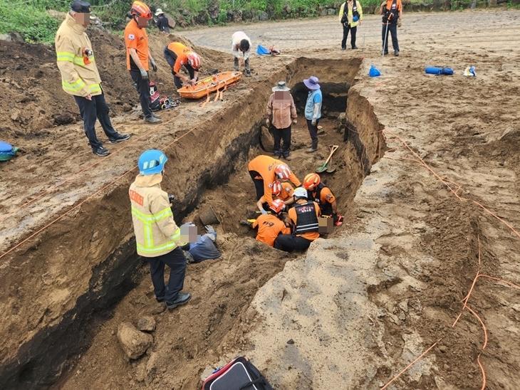 제주시 구좌읍에서 토사 붕괴사고가 발생해 문화재 표본을 조사하고 있던 관계자 2명이 매몰됐다. 도 소방안전본부 제공