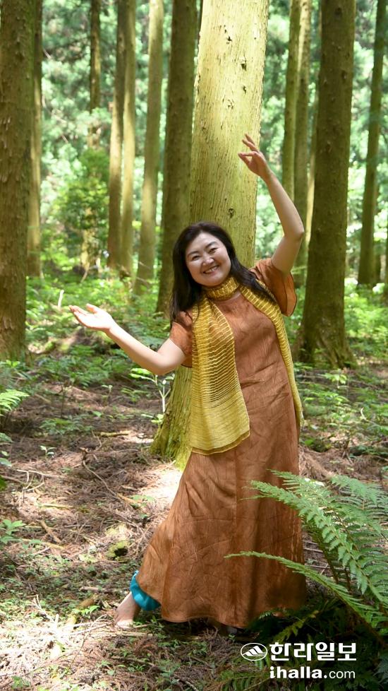 지난달 16일 사려니숲에서 춤 동작을 선보이는 현경희 씨. 그는 '힐링커뮤니티댄스' 지도자로 활동하고 있다. 사진=신비비안나 기자