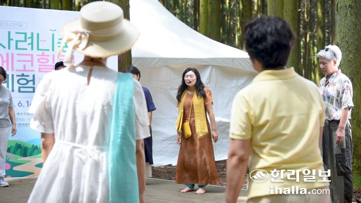 올해 사려니숲 에코힐링 체험행사에서 '생태춤 명상' 프로그램을 진행 중인 경희 씨. 사진=신비비안나 기자