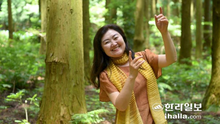 "지금 이 순간, 해 보고 싶은 걸 다 하세요. 내 몸의 느낌, 감각, 정서를 느끼고 수확하세요." 지난달 16일 푸름이 내려앉은 사려니숲 무대에 선 현경희(62, 제주시 화북) 씨가 말했다. 그와 함께 둥글게 모인 사람들이 솔바람에 흔들리는 나무가 된 듯 몸에 힘을 빼고 가벼이 움직였다. 해마다 '사려니숲 에코힐링 체험행사'가 열릴 때면 경희 씨는 '생태춤 명상'을 선보이고 있다. 자연 안에서 명상처럼 마주하는 춤이 치유의 메시지를 전하길 바라는 마음에서다.