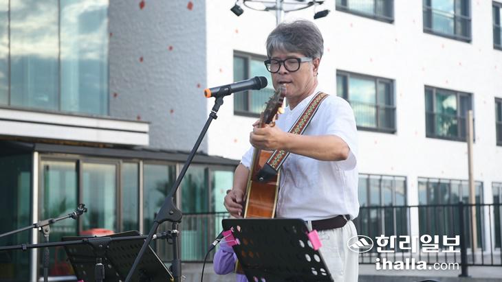 [한라일보] 노을이 내려앉은 바다가 붉게 빛나던 지난 16일 제주시 삼양해수욕장에서 강석용(66) 씨가 기타를 메고 마이크 앞에 섰다. 백사장에 맞닿은 잔디밭을 무대 삼아 연 '반짝 공연'이었다. 하모니카를 부는 박순 씨와 쌓아올린 흥겨운 리듬 위에 얹어진 건, 다름 아닌 '제주'였다. 바닷바람에 실린 노래 'I Love jeju'(아이 러브 제주)를 타고 한라산, 곶자왈이 춤을 췄다. 석용 씨가 곡을 쓰고 제주를 담은 노래다.