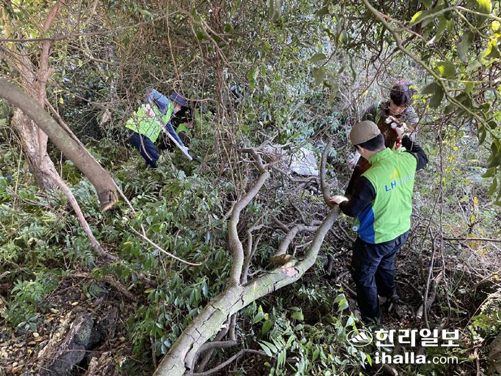곶자왈 지역에서 폐기물을 수거하고 있는 LH제주지역본부 임직원들의 모습.