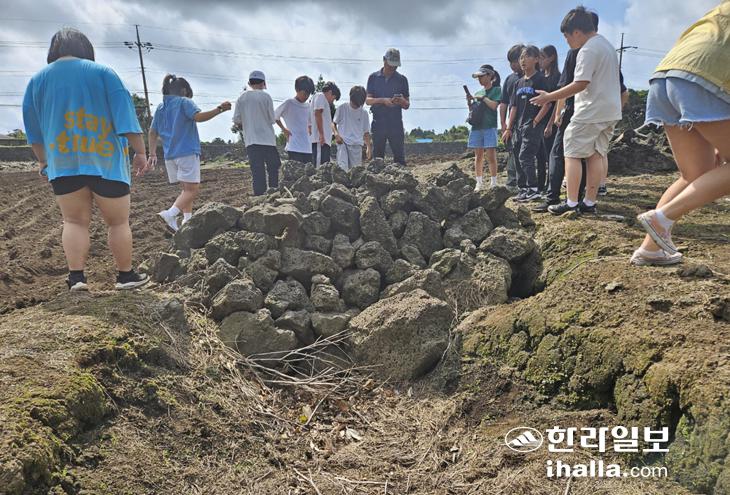 이날 오전 9시 학교에서 출발한 이들은 9시 50분쯤 서귀포시 성산읍 수산리의 한 농지 내 숨골을 찾았다. 이 숨골이 위치한 농지에는 월동무가 심어져 있어 학생들은 두둑 사이 움푹 들어간 고랑을 따라 조심스럽게 숨골이 있는 곳으로 이동했다.