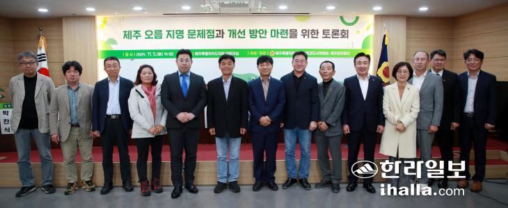 5일 제주도의회 대회의실에서 열린 '제주 오름 지명 문제점과 개선 방안 마련을 위한 토론회'에서 참가자들이 기념사진을 찍고 있다. 강희만기자