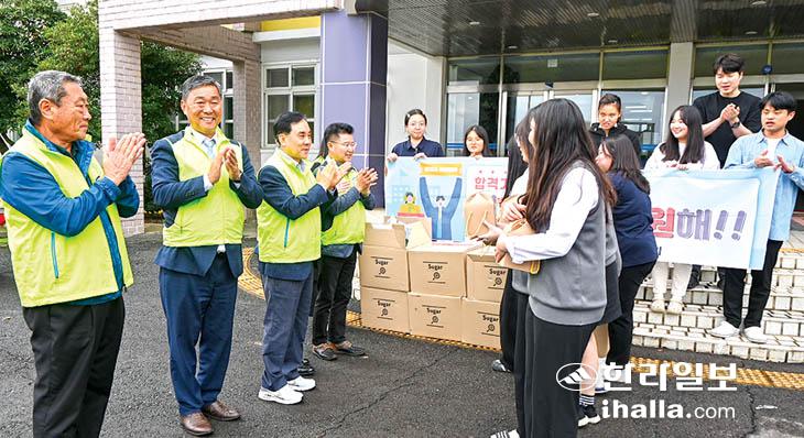 대정읍청소년지도자협의회(회장 문대준)는 지난 4일 수능을 앞둔 대정여자고등학교(교장 서자양) 3학년 수험생들에게 응원물품을 전달했다. 협의회는 매년 대입 수능을 앞둔 지역 내 수험생들을 격려해오고 있다.