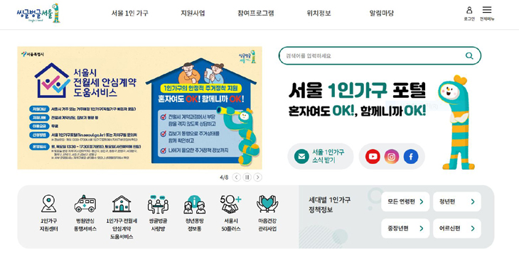 서울특별시가 운영하는 1인가구 포털 '씽글벙글 서울'은 주목할 만하다. 서울시는 물론 25개 자치구, 청년센터, 50플러스재단, 복지관 등이 진행하는 1인가구 지원 프로그램 정보를 한 데 모은 플랫폼이다. 프로그램 참가 신청도 가능하다. 서울시에 따르면 2021년 9월부터 운영된 이 플랫폼에는 하루 평균 1300명이 방문하고 있다.