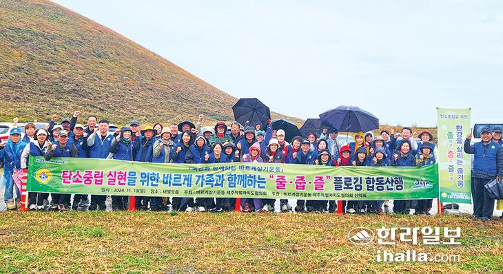 바르게살기운동 제주특별자치도협의회(회장 좌중언)와 산악회(회장 정승익)는 지난 10일 애월읍 새별오름 일대에서 바르게 가족 70여 명이 참여한 가운데 '탄소중립 실현을 위한 바르게 가족과 함께하는 줄(이고)·줍(고)·즐(기자) 플로깅 합동산행'을 했다.