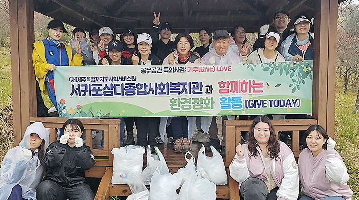 (재)제주특별자치도사회서비스원 서귀포삼다종합사회복지관(관장 조성태)은 지난 15일 '기부(GIVE) LOVE'사업에 참여 중인 서귀포상상로타리클럽(회장 고인숙)과 이승악오름 주변 환경정화 활동을 펼쳤다.