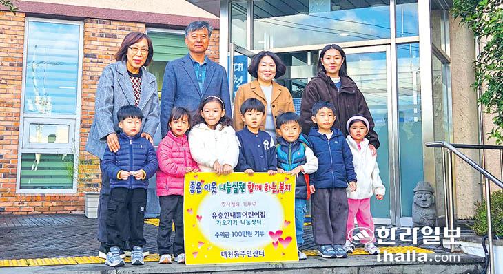 공립유승한내들어린이집(원장 양미숙)은 지난 4일 서귀포시 대천동주민센터(동장 윤세명)를 방문해 '가져오고 가져가는 나눔 장터'에서 발생한 판매 수익금 100만원을 대천동 취약 계층을 위한 성금으로 기탁했다.