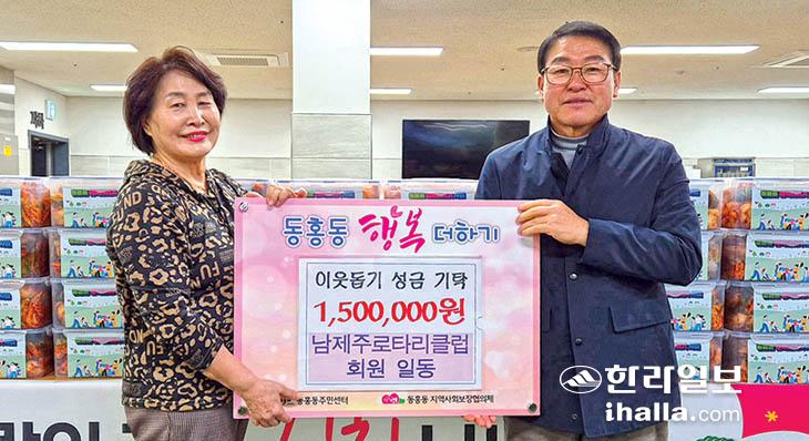 남제주로타리클럽(회장 강경종)은 지난 3일 이웃 돕기성금 150만원을 서귀포시 동홍동에 전달했다. 이번 성금은 '겨울 김치 나누기' 지역 사업 후원에 사용됐다.