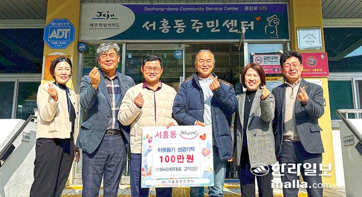 [한라일보] (주)아시네(대표 고덕선)는 지난 3일 서귀포시 서홍동을 방문해 어려운 이웃을 위해 사용해 달라며 이웃 돕기 성금 100만원을 서홍동지역사회보장협의체(위원장 오희경·변정철)에 기탁했다.