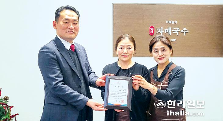 자매국수 문애순 대표가 도민 생명보호를 위한 혈액사업 발전에 헌신한 공로를 인정받아 제주도 제주시장 표창을 받았다.