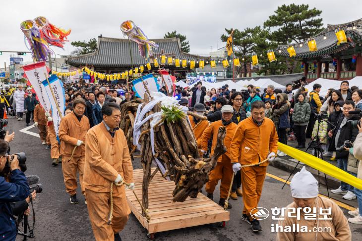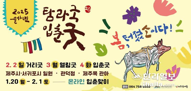 [한라일보] 새봄을 맞으며 한 해 무사 안녕을 기원하는 '탐라국입춘굿'이 오는 20일 '입춘 맞이'로 시작된다. 지난해에 이어 올해도 서귀포까지 굿마당을 넓히고, 시민이 함께하는 '낭쉐몰이'로 공동체의 연대를 빈다. 12·3 비상계엄 사태 등 어두웠던 세밑을 뒤로하고 희망이 넘치길 바라는 뜻을 담은 올해의 슬로건은 '봄, 터졌소이다!'다.