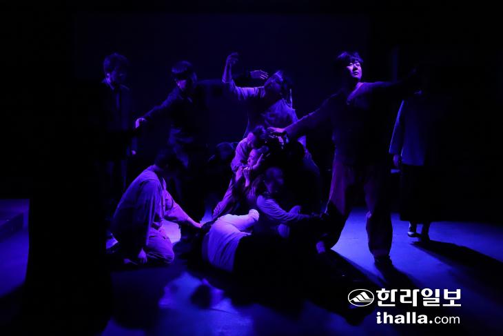 가해자와 피해자의 구분 없이 떠난 자와 남은 자를 감싸안는 듯한 배우들의 몸짓. 제주4·3평화공원에 놓인 모녀 조형물 '비설'(飛雪)을 형상화했다고 한다. 극단 세이레 제공
