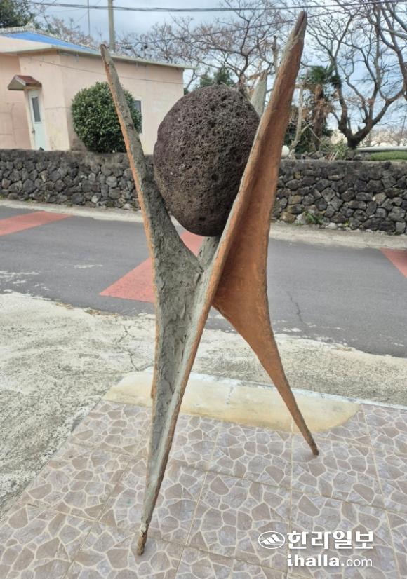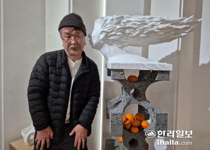 서양화를 전공했지만 캔버스 앞에만 있지 않았다. 작업 무대는 사실상 '제주섬'이었다. 그가 돌을 깎고 다듬어 만든 조형물은 '공공미술'이 됐다. 제주문학관 앞 제주시 연북로에 있는 길이 150m의 돌난간도 알고 보면 그의 작품이다. 산지천 등 공공 영역에 더해 민간까지 범위를 넓히면 도내 150여 곳에 그의 손길이 닿아 있다. 이런 노동의 시간이 1986년부터 지금까지 39년, 비로소 첫 조형전을 열고 있다.