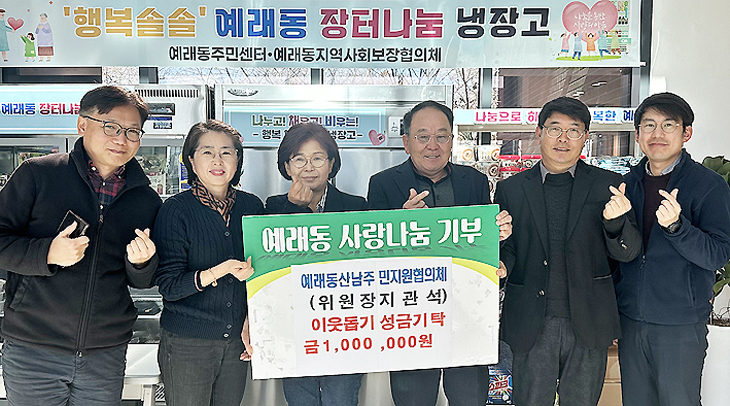 서귀포시 예래동 산남주민지역협의체(위원장 지관석)는 지난 13일 예래동 주민센터를 방문해 예래동 지역사회보장협의체(위원장 김지호)에 장터나눔 냉장고 사업 추진에 사용해 달라며 성금 100만원을 기탁했다.