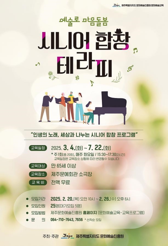 [한라일보] 제주특별자치도 문화예술진흥원이 예술로 마음돌봄 '시니어 합창 테라피' 교육생을 모집한다. 지난해에 이어 올해도 마련한 생애 주기별 맞춤형 문화예술 교육의 하나다.