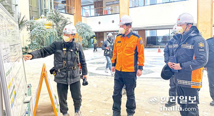 제주소방서(서장 전철하)는 19일 The-K 제주호텔 대수선 공사장을 방문해 화재 예방을 위한 현장 안전 지도를 실시했다.