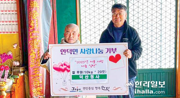 서귀포시 안덕면 덕산정사 현우 주지스님 외 신도 일동은 지난 17일 안덕면 지역 내 취약계층 가구에 지원해달라며 쌀 10㎏ 20포를 안덕면 주민센터(면장 김태유)에 기부했다.