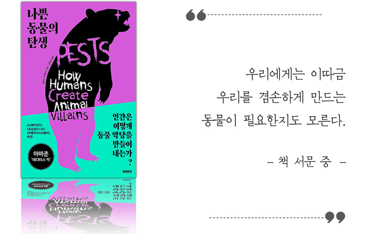 그렇다면 노루는 '나쁜 동물'일까. 과학 저널리스트 베서니 브룩셔의 '나쁜 동물의 탄생'(김명남 옮김)은 "결국 관점의 문제"라고 말한다. 이 책에는 어제 사랑받던 동물이 오늘 미움을 받는가 하면, 오늘 경멸당하던 동물이 내일 감탄의 대상이 되기도 하는 사례가 가득하다. '역병 같은 쥐', '비둘기 똥', '골치 아픈 고양이' 등 모두 11장을 따라 동물에 대한 인간의 공포와 혐오, 보는 사람에 따라 달라지는 시각을 짚으며 인간의 모순적인 관점을 탐구한다.