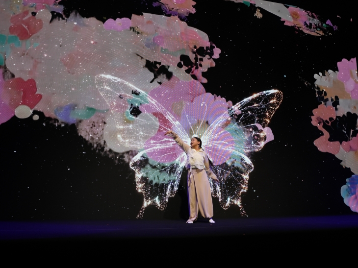 1시간여의 공연을 장식한 사물타악과 전통 춤·노래, 미디어아트의 합주는 낯섦 없이 조화로웠다. 깊은 슬픔에서 신명의 길로 빠져나오는 몸짓과 가락의 변주를 따라 시시각각 바뀌는 미디어아트가 극의 분위기를 고조했다. 천둥 번개가 쳤다가 기메(종이로 만든 무구)가 휘날리기도 하고, 샛노란 유채꽃을 흩뿌리기도 했다. 미디어아트라는 옷을 입은 극의 공간은 지상에서 저 머나먼 우주, 별나라까지 뻗어가기도 했다.