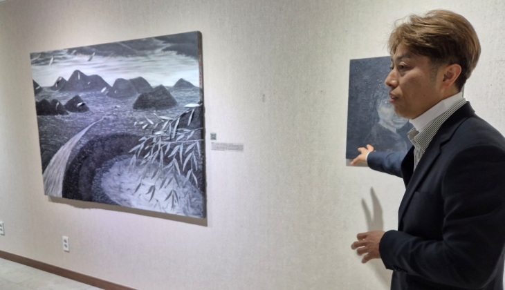 오명식 작가가 지난 22일 제주문예회관 제3전시실에서 자신의 개인전 '4·3과 그리움'에 전시된 작품에 대해 설명하고 있다. 김지은기자