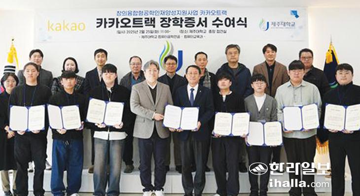 (주)카카오(대표이사 정신아)는 컴퓨터 소프트웨어 인재 육성 위해 25일 제주대학교에 장학금 2000만원을 기탁했다. 장학금은 제주대 컴퓨터공학전공과 컴퓨터교육과 소속 20명의 학생들에게 전달됐다.