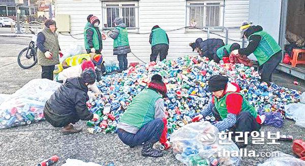 [한라일보] 제주시 도두동 새마을부녀회(회장 이영지)는 지난 25일 부녀회 사무실에서 회원 19명이 참여한 가운데 캔·고철 수집과 판매작업을 실시했다. 부녀회에서는 재활용품을 판매해 얻은 수익금을 이웃돕기에 사용하고 있다.