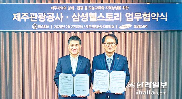 제주관광공사(사장 고승철)와 삼성웰스토리(사장 정해린)는 27일 제주웰컴센터에서 제주 농촌지역의 경제·관광 등 도농 교류 상생을 위한 업무협약을 체결했다.